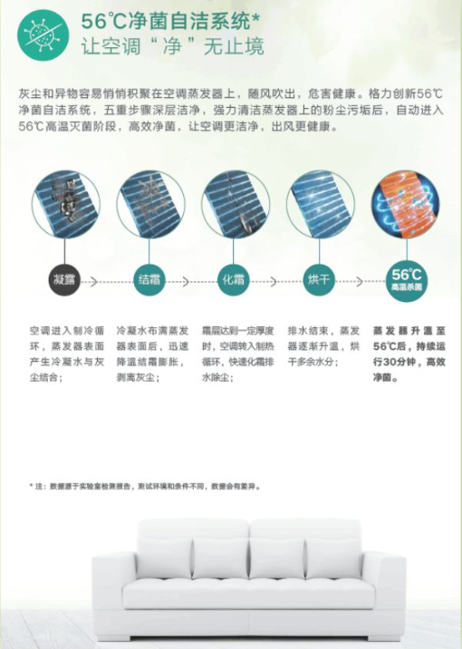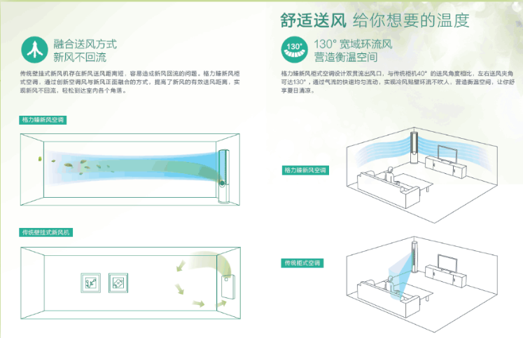 創(chuàng)新格力G-Air鮮凈新風(fēng)科技,雙向換氣+雙殺菌;配置格力UVC安全除菌和56℃凈菌自潔系統(tǒng),可殺滅細(xì)菌病毒;新鮮空氣“凈”無止境,融合送風(fēng)方式提高送風(fēng)距離,新風(fēng)不回流,換氣更徹底。130° 送風(fēng)夾角實(shí)現(xiàn)冷風(fēng)貼壁環(huán)流不直吹 ,輕松營造衡溫空間,盡享清新居家體驗(yàn)。
