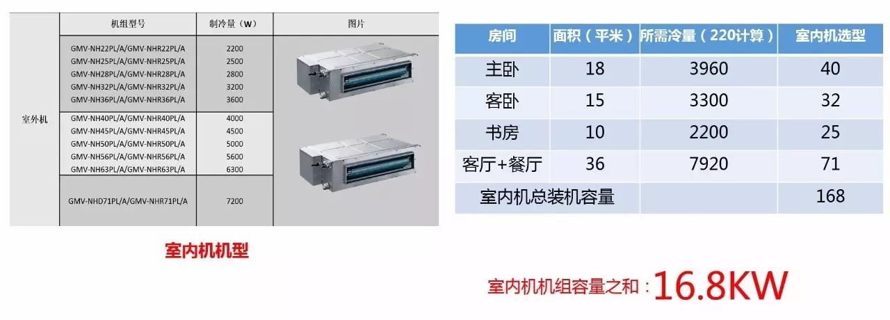 測算出顧客每個房間的實際面積之后,接下來我們根據(jù)房間面積x220W/平米,來計算此房間所需要的冷量,對著室內(nèi)機型號選定對應(yīng)室內(nèi)機機型。依次類推選出每個房間的機型,將所有選定的室內(nèi)機組裝機容量相加得出16.8kw.