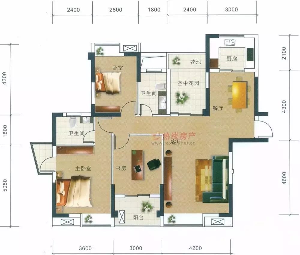 主臥:18平米 客臥:15平米 書房:10平米 客廳:24平米 餐廳:12平米