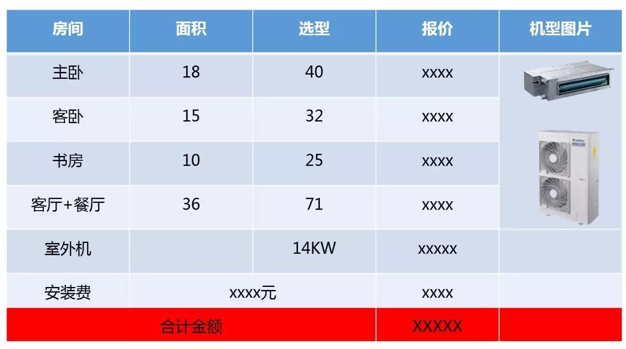 羅列出選配表格,并根據(jù)室內(nèi)機、室外機機型填寫銷售價格,根據(jù)顧客的實際按照情況確定安裝費用,然后將所有的價格一相加就是正常的報價。